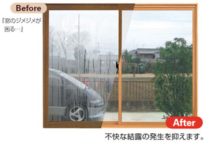 結露抑制効果で「快適」窓周辺は外気に影響されやすく、外気温が下がると室内側の空気が冷やされて結露が起こります。 「プラマードU」は結露抑制にも効果を発揮します。 樹脂の熱伝導率は1/1000窓ガラスの結露は掃除も大変なうえ、住まいを傷める原因にもなります。 ![]() |