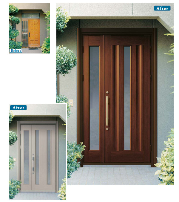 外壁はそのまま、1日で玄関ドアをリフレッシュ。 リフォームドアは、壁や床を壊さない”カバー工法”を採用した簡単施工。 デザインの美しさはもちろん、防犯や使いやすさへの配慮などを兼ね備えています。