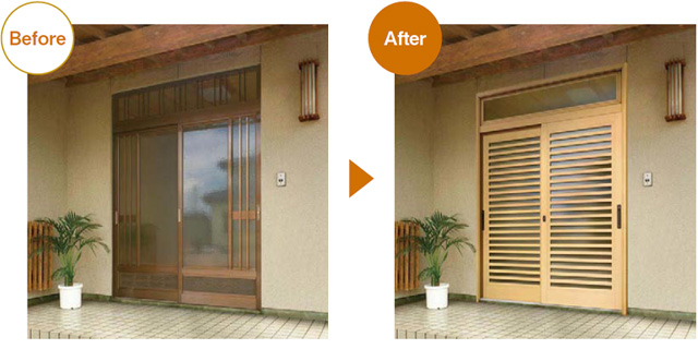 外壁はそのまま、1日で玄関引戸をリフレッシュ。 リフォーム玄関引戸は、壁や床を壊さない”カバー工法”を採用した簡単施工。 デザインの美しさはもちろん、防犯や使いやすさへの配慮などを兼ね備えています。